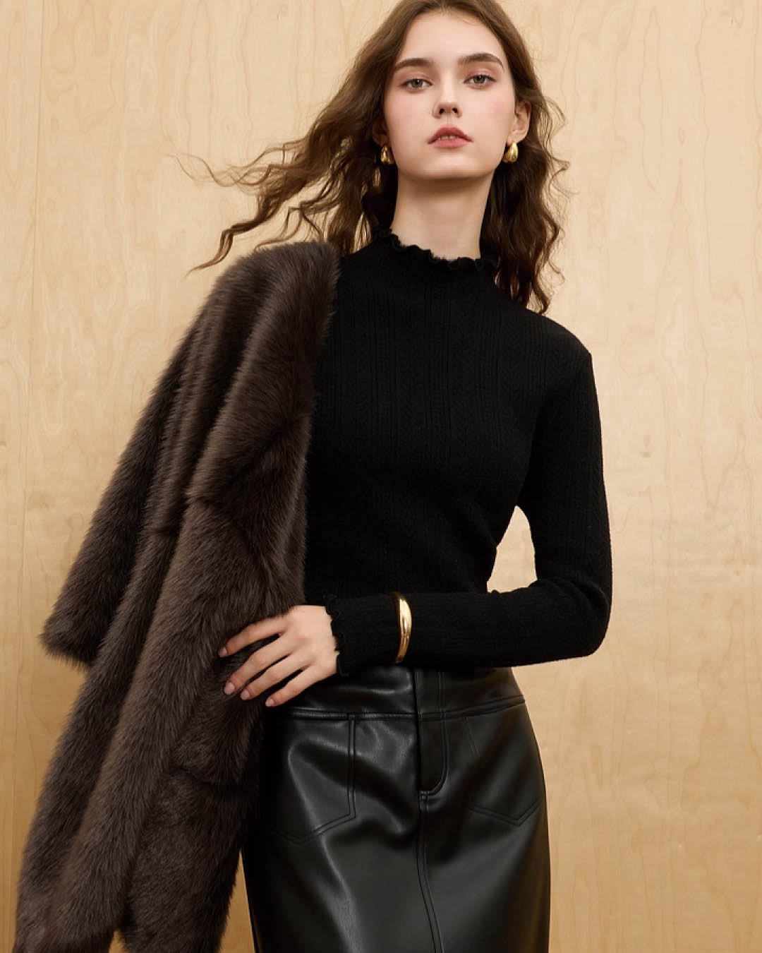 やわらかく編み上げられたリブニットに、襟元と袖口のさりげないメロウフリルが愛らしさを添えるトップス。