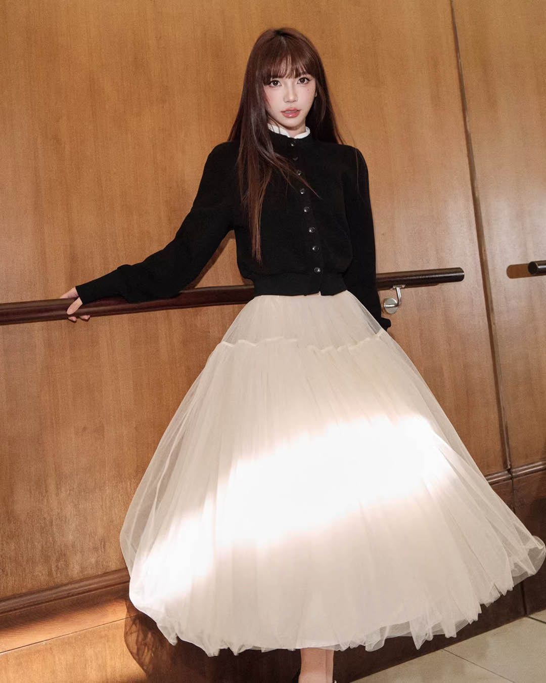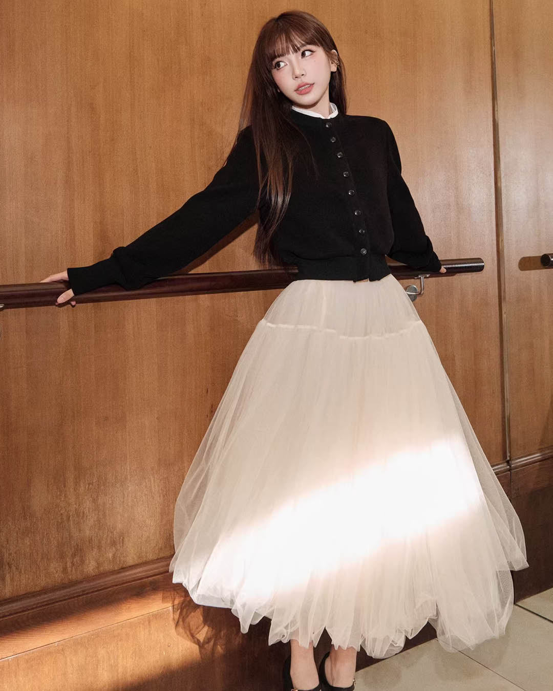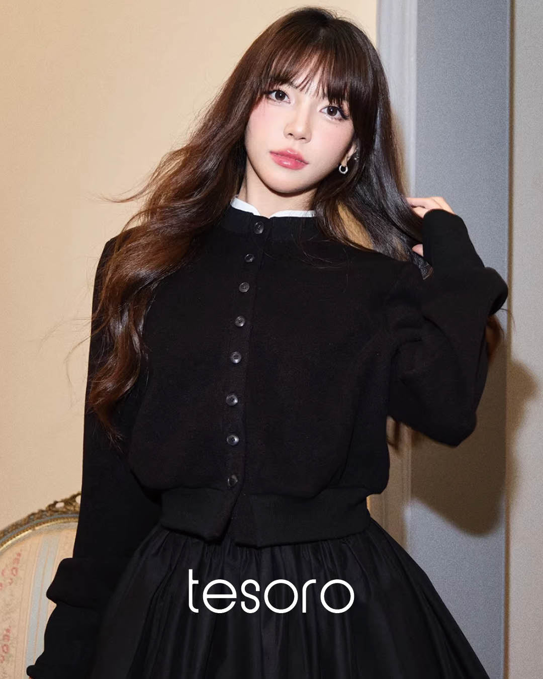 前立てのボタンディテールが控えめなアクセントになり、ニット素材のふくらみが体のラインを拾いすぎず、着心地も快適。
